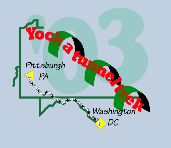 Announcing the FIFTH ANNUAL Yokatomac Trek Page Updated March 6, 2003 U C 03 Tunnel Trek (You See three tunnels) Paw Paw, Borden, and the newly renovated Savage Mountain tunnel A fully supported bicycle ride from Washington, DC to Pittsburgh, PA via the C&O Canal Towpath and the Great Allegheny Passage Including passage though three tunnels, The Paw Paw Tunnel on the C& O Canal, The short Borden Tunnel on the Allegheny highlands in Maryland and the first official passage through the newly renovated Savage Mountain Tunnel June 7 through 15, 200 Itinerary Note: All lodgings are within a short biking distance of the trail except as noted. Make your reservations as soon as possible Saturday, June 7, 2003, in Washington, DC Lodging: St. Gregory Luxury Hotel and Suites 2033 M Street, NW Washington, DC 20036-3305 Rate $149/double occupancy Reservations: 800-829-5034 or 202-530-3600 Reservation deadline: May 8, 2003 Cancellation policy: 72 hours Method of payment: Cash, check, credit card Camping No convenient camping available.